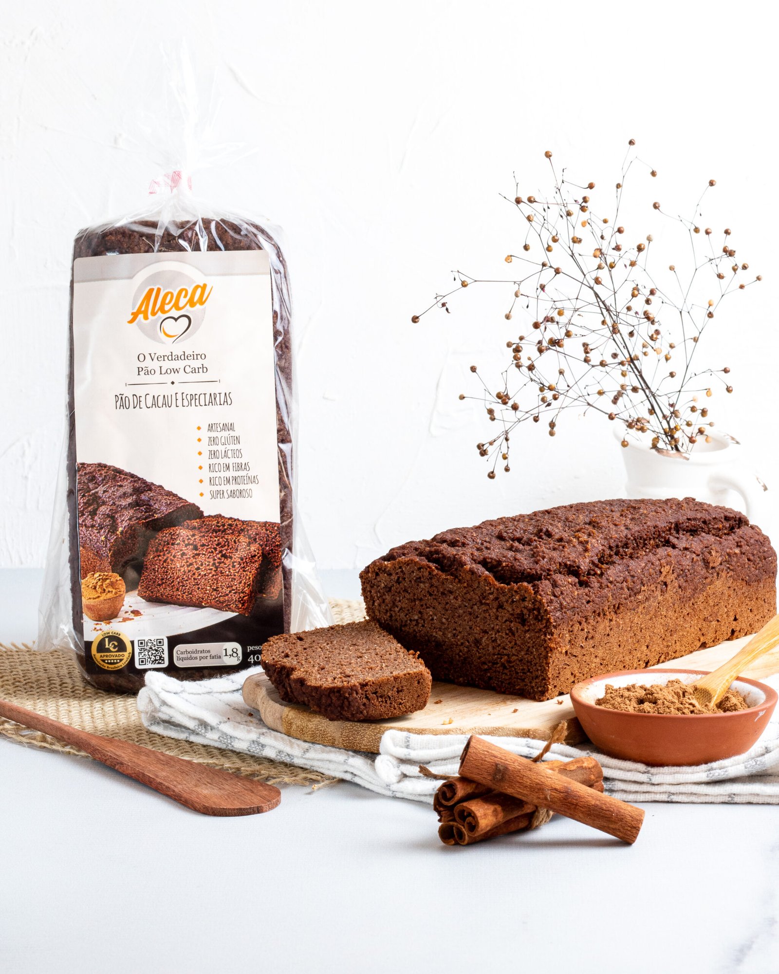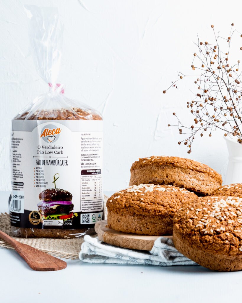 Ingredientes: Água, farinha de castanha de caju, ovo integral desidratado, eritritol, farinha de coco, cacau em pó, fermento biológico, vinagre, psyllium, bicarbonato de sódio, sal e especiarias.