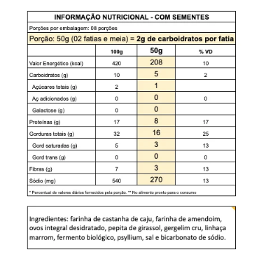 Ingredientes: farinha de castanha de caju, farinha de amendoim, ovo integral desidratado, psyllium, pepita de girassol, sementes de linhaça marrom, gergelim, fermento biológico, sal e bicarbonato de sódio